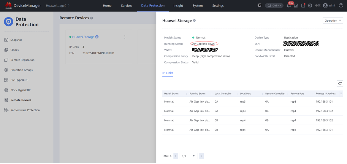 Functions as a replication link isolation switch, which enables the replication links only when a replication job is running and disables the replication links after the replication job is complete. The enabling and disabling of the entire replication links can be controlled only in the isolation zone. This solution uses the OceanStor BCManager eReplication software in the isolation zone to configure Air Gap replication policies. In this way, the replication links are enabled only during data replication and disabled immediately after data replication is complete.