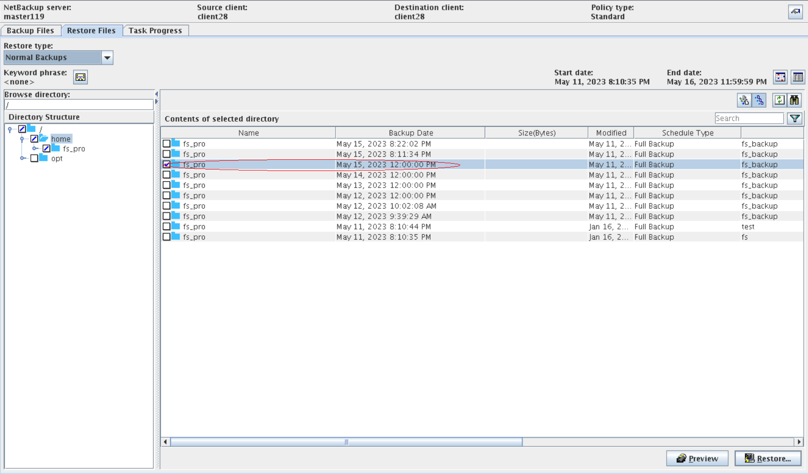 Step 12 On the Restore Files page, enter / in Browse directory, select a copy generated at a certain time, and click Restore.