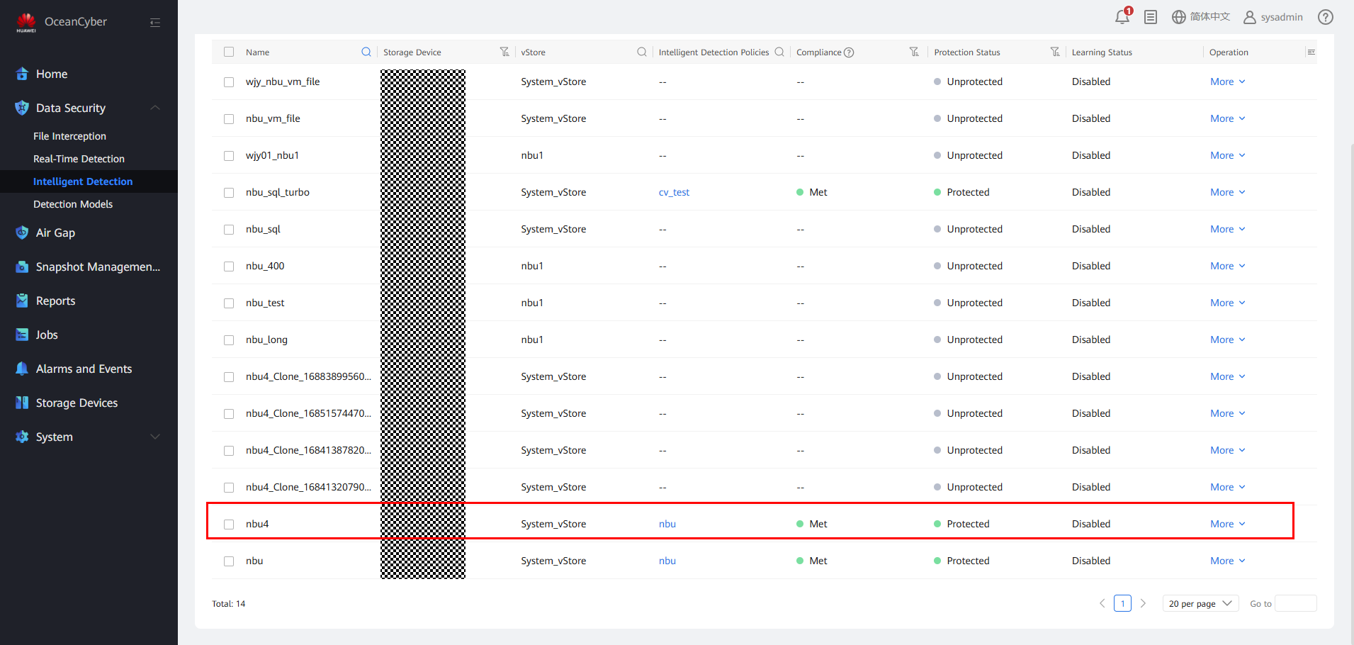 The detection and analysis function of OceanCyber 300 provides ransomware encryption detection and in-depth detection on backup copies. The built-in detection function of the OceanProtect Backup Storage (X8000 and later models) supports only ransomware encryption detection on backup copies.