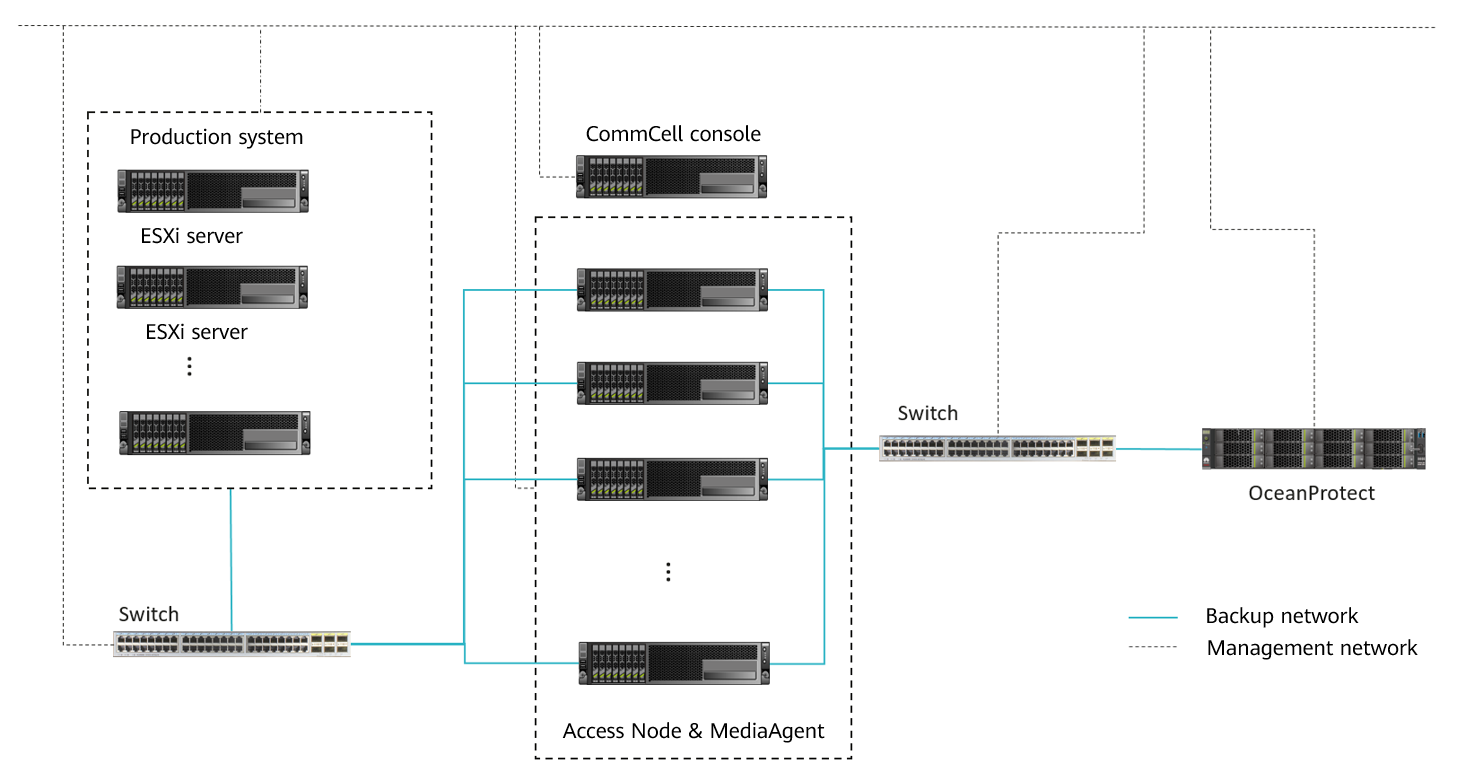 - Production environment: Commvault is used to back up four ESXi hosts, including 32 VMs. 500 GB data is preset on each VM. The total data volume is about 14.5 TB.