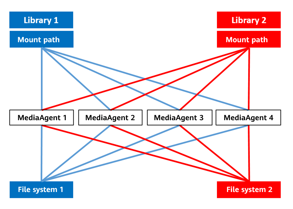 - The GridStor solution in 3.3.4 Commvault Deployment Planning is tested in the typical server configuration scenario. Two libraries are created. For details, see Figure 3-11.