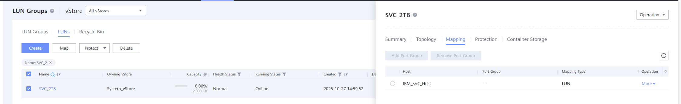 The storage’s Fibre Channel ports are dedicated to IBM SVC and cannot be shared with other hosts or used for other purposes. Port sharing is only functional during data migration and for a limited time.
