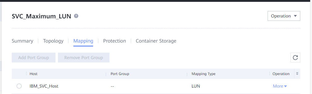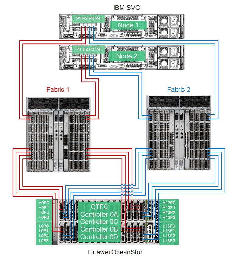 Each Huawei storage system can use up to 16 Fibre Channel ports to connect to IBM SVC. There are 4 Fibre Channel ports used to connect to IBM SVC in this Test.