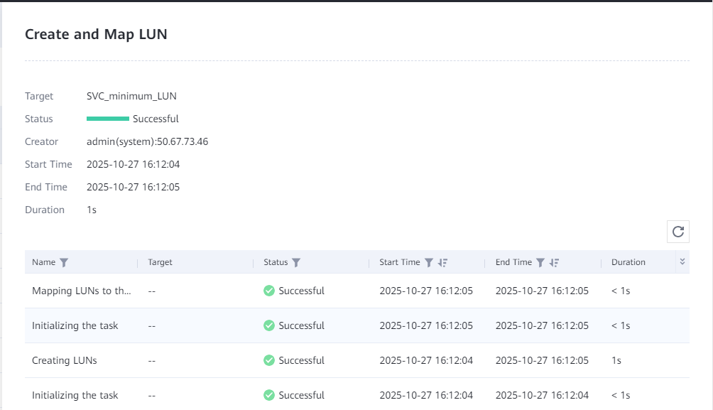 2. Step 2 Map the LUN,  3. Step 3 Scan for external storage on the gateway storage, no errors are reported during scanning, and the LUNs mapped by Huawei storage are successfully detected on the gateway storage  4. Step 4, Check the WWN of the LUN on the gateway storage  5. It is consistent with that on the Huawei storage  |