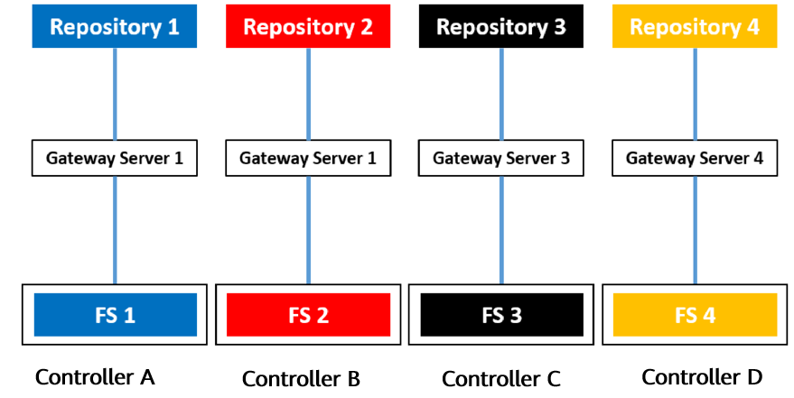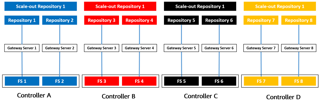 In this best practice, the two file systems that belong to controller A of OceanProtect X9000 are configured in one scale-out repository, and the two file systems that belong to controller B are configured in the other scale-out repository.