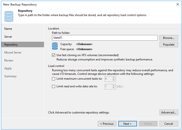 If the gateway server uses Linux source deduplication and Fast Clone is required for synthetic full backup, select Use fast cloning on XFS volumes.