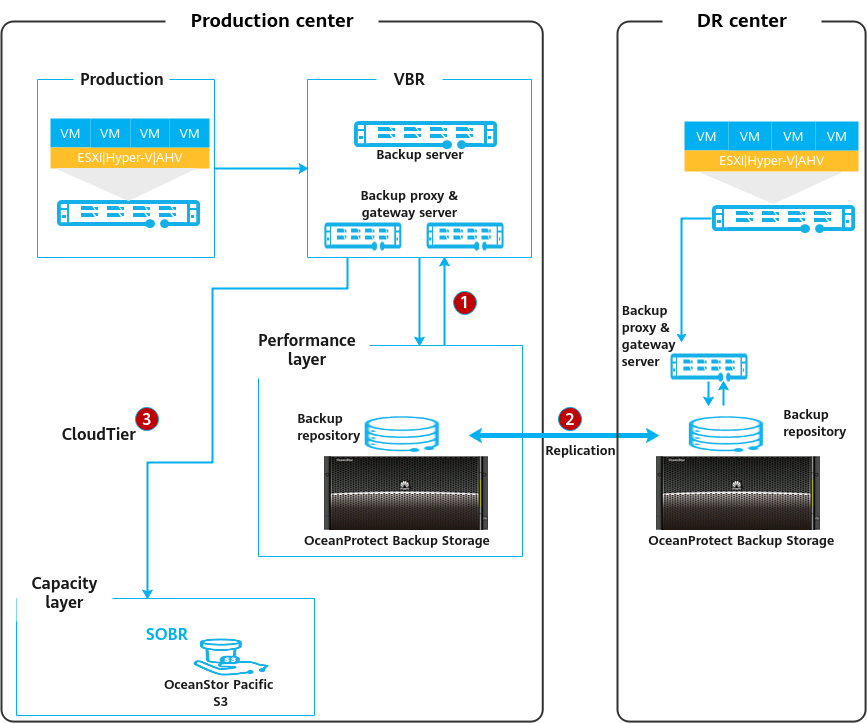 This solution uses the Veeam Backup & Replication 12 backup software to back up VMs to the OceanProtect Backup Storage. By establishing replication links between the local and remote ends, you can use the remote replication feature to replicate copies to the remote end.