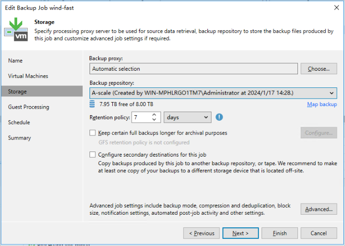 Step 3 On the Storage page, retain the default setting Automatic selection for Backup proxy and select the previously configured scale-out backup repository for Backup repository.