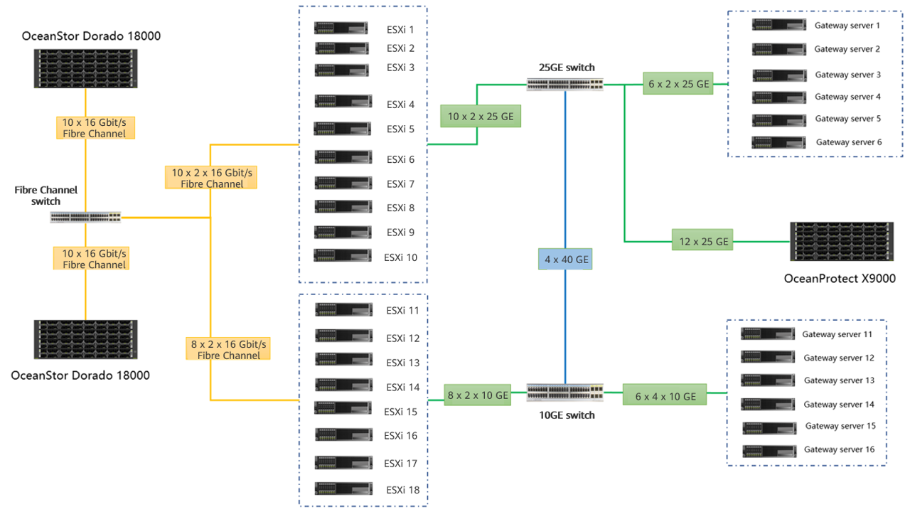 - Gateway server: Some hosts use two 25GE bond ports to connect to ESXi physical hosts and OceanProtect X9000 through a 25GE switch. Some hosts use two 10GE links to communicate with ESXi physical hosts and two 10GE links to communicate with OceanProtect X9000.