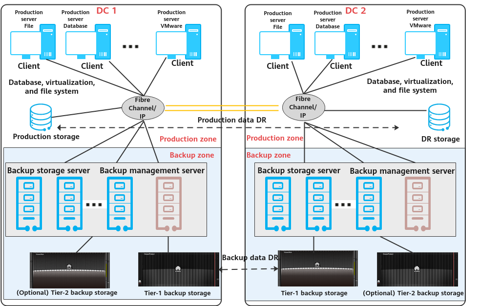 - Backup storage: is connected to the backup storage server and used to receive and store backup data. Some backup storage devices also provide deduplication and compression. Based on service requirements, backup storage can be designed as two tiers. Tier-1 backup storage provides fast and efficient backup and data restoration capabilities, delivering optimal backup and restoration performance. The cost of tier-1 backup storage is high, and data deduplication and compression are important. Tier-2 backup storage stores data for a long term at a low cost. Backup copies stored for more than a certain period of time are migrated to tier-2 backup storage, achieving the optimal comprehensive retention cost. Common backup storage types include backup storage, general-purpose storage, virtual tape libraries (VTL), object storage, and tape libraries.