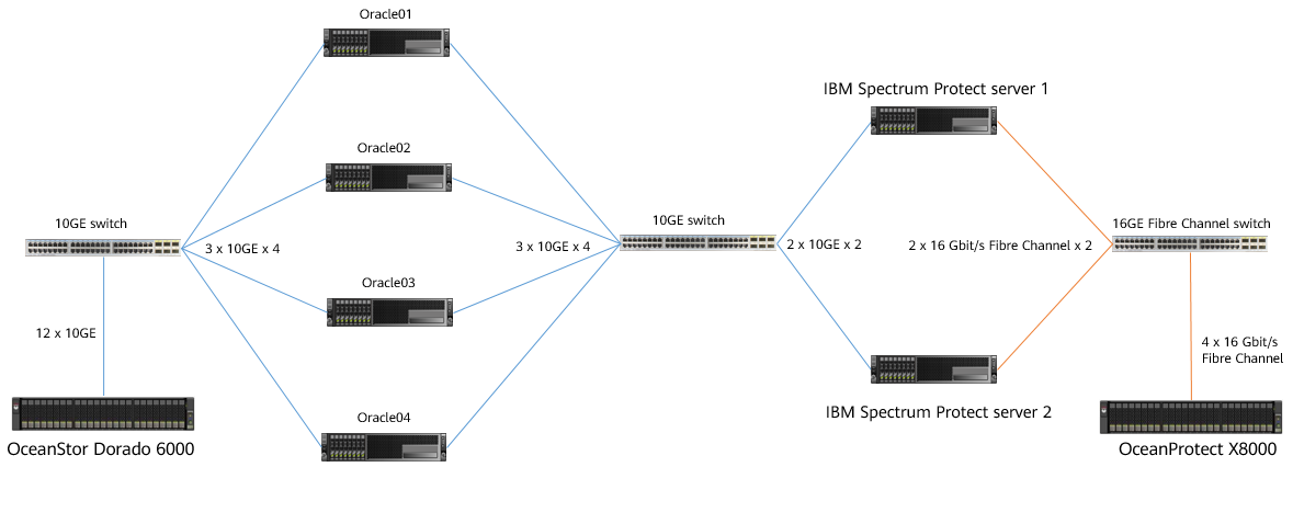 - Backup environment: OceanProtect X8000 (all-flash) is deployed. Create file systems on the OceanProtect X8000 and connect them to one IBM Spectrum Protect server through DataTurbo over a Fibre Channel network.