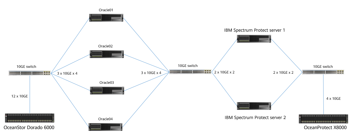 - Backup environment: OceanProtect X8000 (all-flash) is deployed. Create file systems on the OceanProtect X8000 and connect them to one IBM Spectrum Protect server through the NFS protocol.