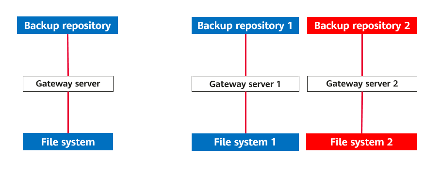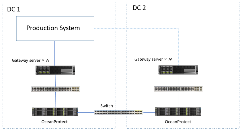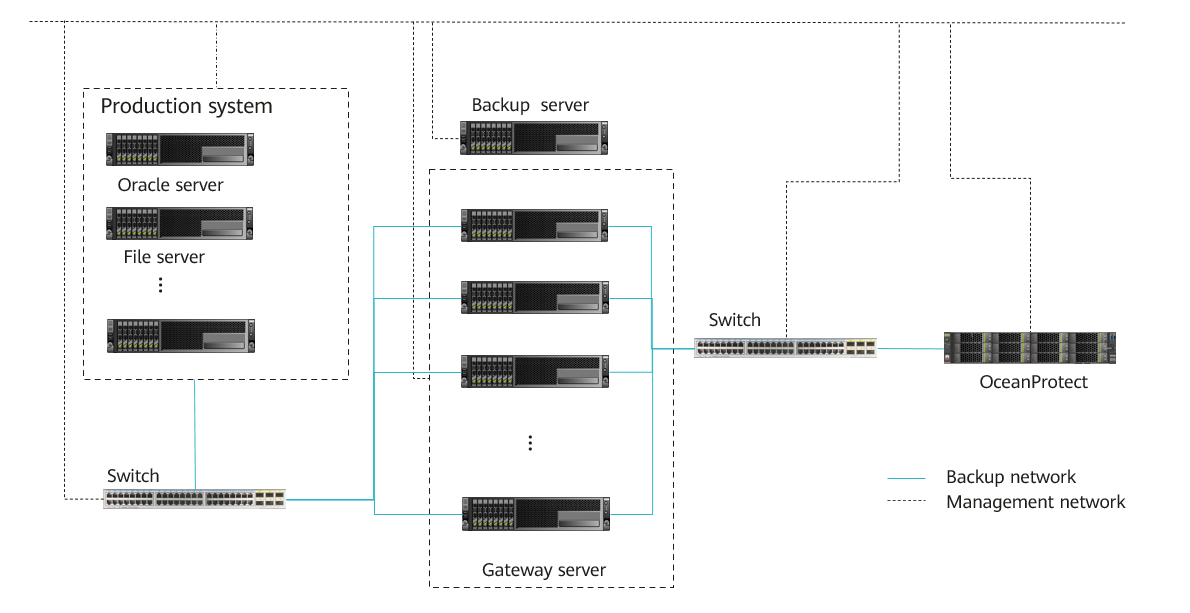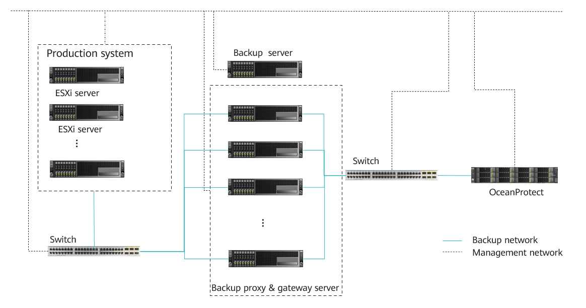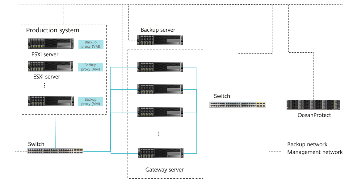 - Gateway server: It connects the production system and backend storage. Generally, the backup proxy also functions as the gateway server. In hot-add transmission mode, the backup proxy is a VM. Therefore, a physical host is used as the gateway server.