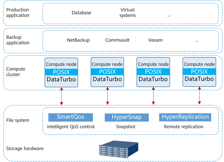 - Compatible with standard POSIX semantics, the DataTurbo client provides data cache algorithms and source deduplication and compression algorithms, enabling upper-layer applications to access storage devices more efficiently.