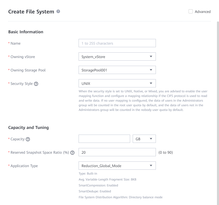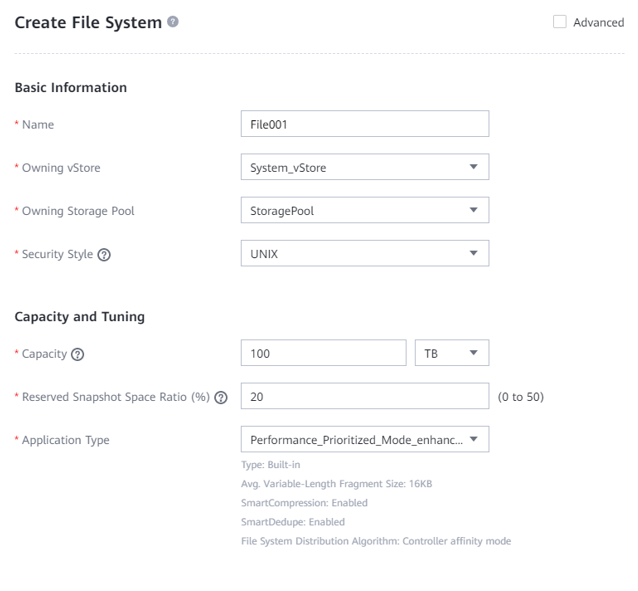- High reduction ratio mode: Set Compression Mode of the storage pool to High reduction ratio and the file system application type to Reduction_Prioritized_Mode_enhanced.