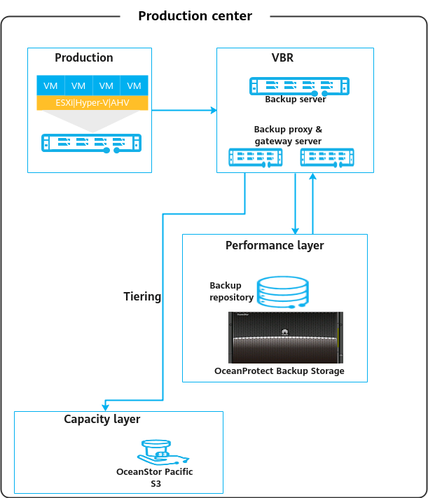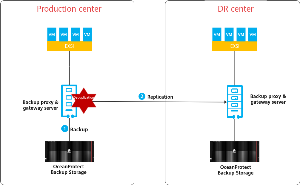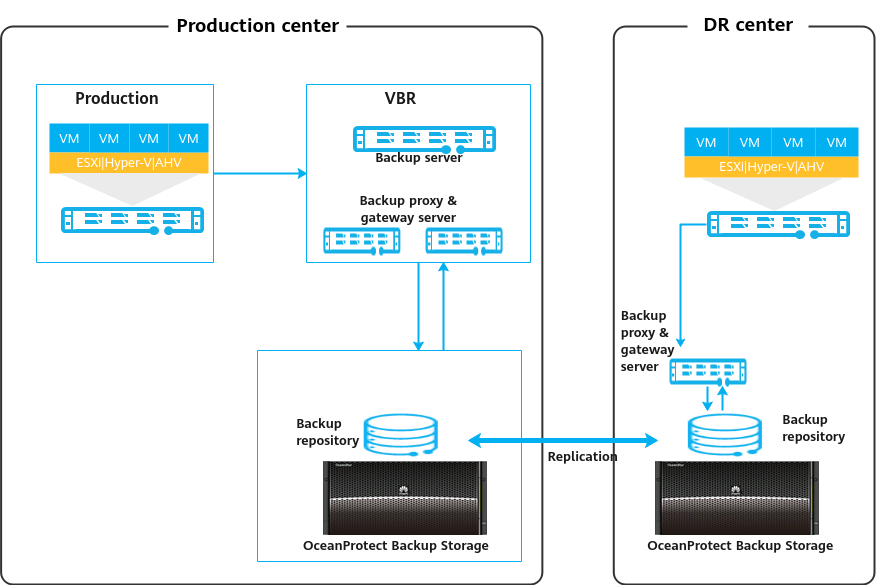 This solution uses the Veeam Backup & Replication 12 backup software to back up VMs to the OceanProtect Backup Storage. By establishing replication links between the local and remote ends, you can use the remote replication feature to replicate copies to the remote end.