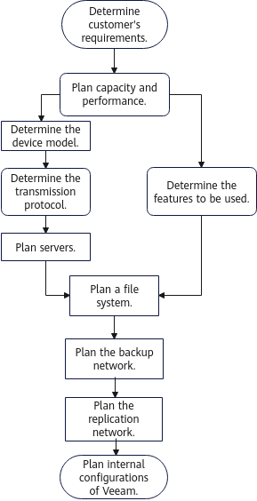 Select the OceanProtect Backup Storage model and determine the transmission protocol and number of backup media servers required for the entire network based on the customer’s capacity and performance requirements. Determine the features to be used based on the required backup software features. Then, plan the file system, backup network, and replication network based on the number of servers, transmission protocol, and used features to complete the planning process.